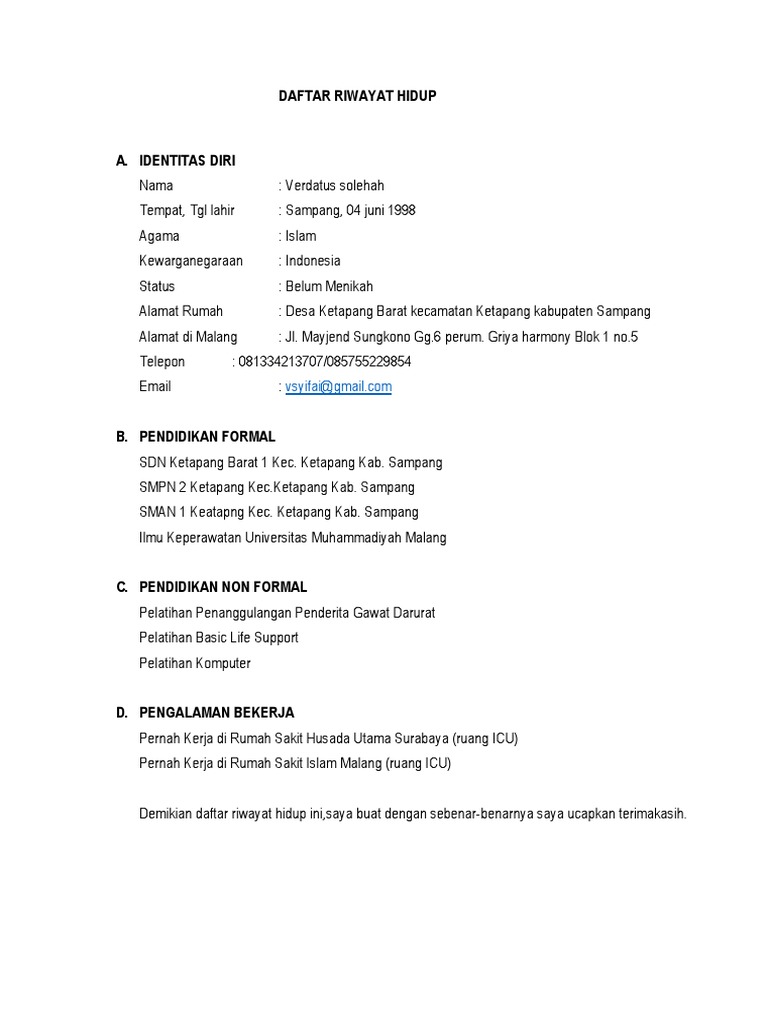 1 contoh daftar riwayat hidup lamaran kerja sederhana terbaru.